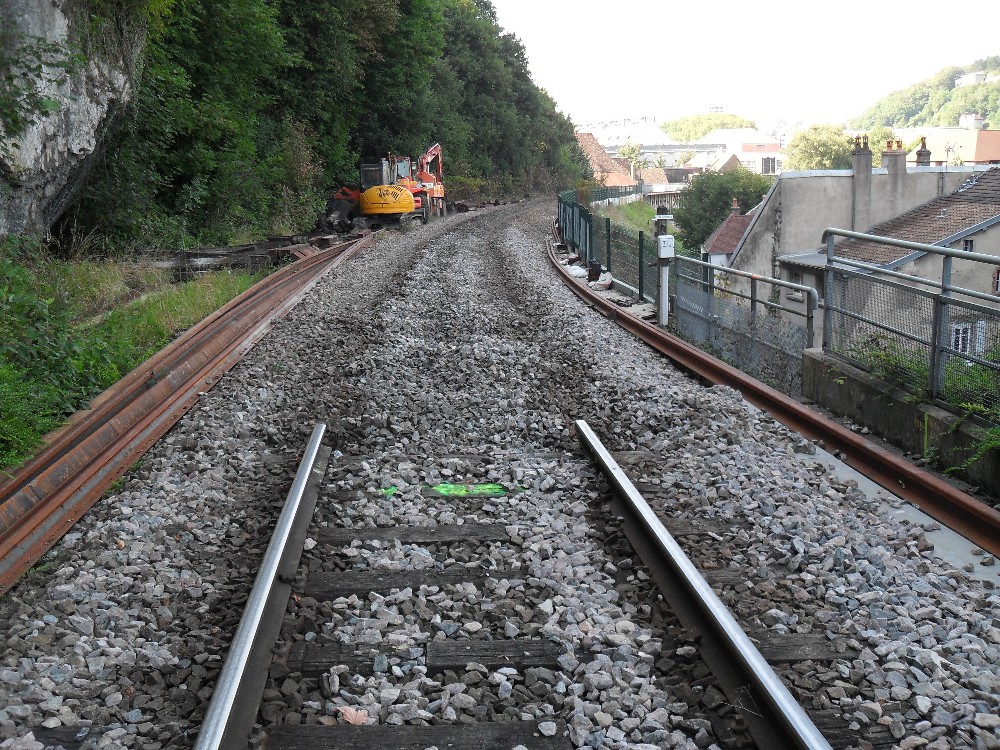 Le chantier est divisé en deux, en bas à gauche de la citadelle, les deux pelles s'activent à mettre les traverses en place, tandis qu'a droite il s'agit de démonter rail est traverses. La partie au centre ne sera traiter que pour le changement de rails, les traverses étant métalliques.