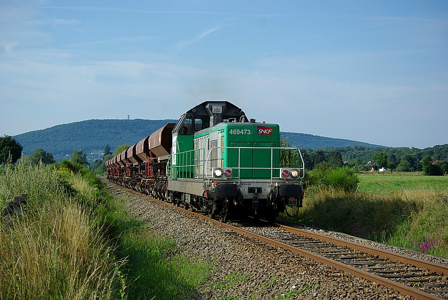 04/08/2010, fret Belfort-Giromagny, peu après Lachapelle-sous-Chaux, avec la colline du Salbert, en arrière-plan, BB 4 69473 et 10 trémies V Uas vides.