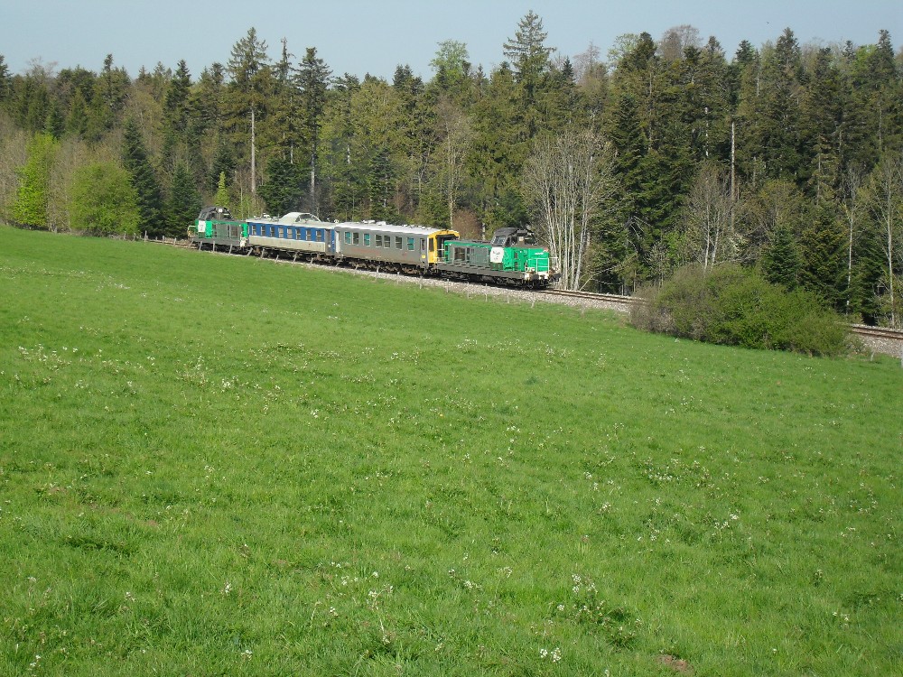 Tout d'Abord la rame de retour de Morteau avec environ 20 minutes d'avance, vue ici entre Avoudrey et Valdahon.