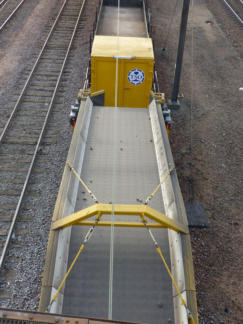 Voici le wagon tapis canon flèche VAD - 99 87 9 310 502-9 de TSO sur une rame de VAD qui manœuvre pour rentrer