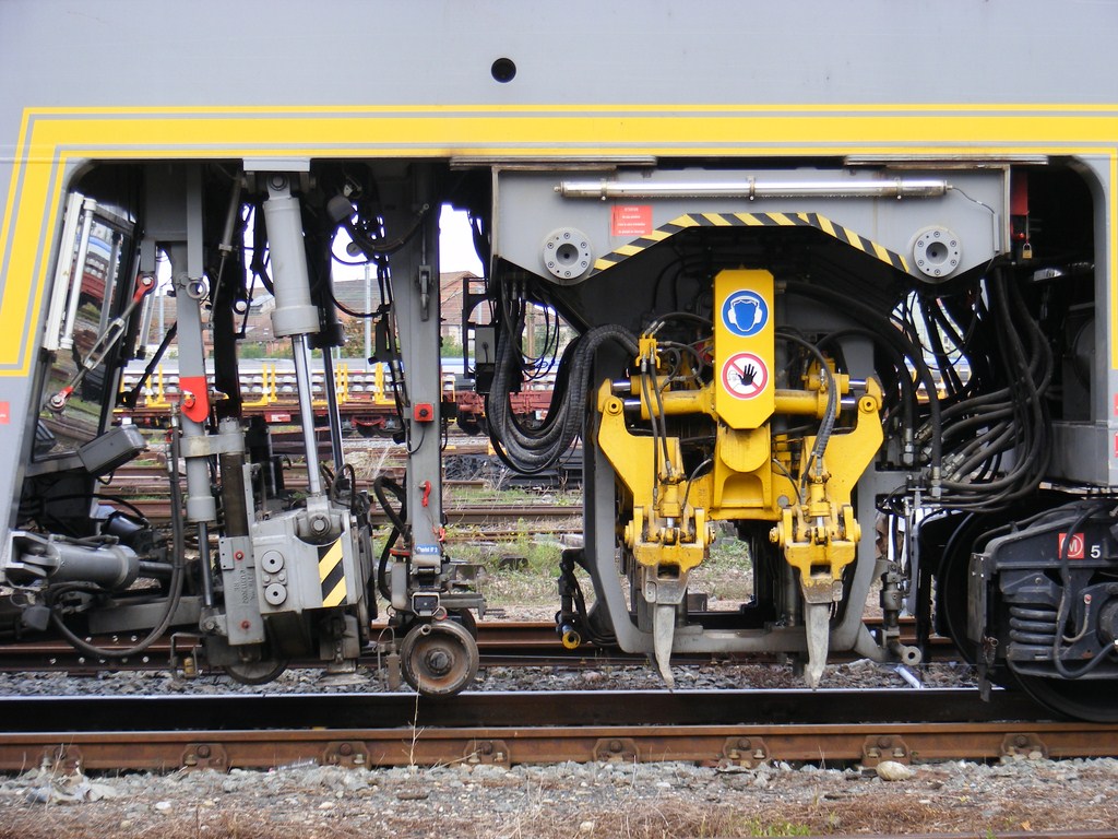 C'est le bras pour la 3ème file de rail. Ca sert à bourrer les appareils, pour soulever la voie déviée en même temps qu'on bourre la voie direct, très utile pour éviter de créer un gauche dans la voie dévié tout en bourrant la voie direct et ça permet également de bien caler la voie dévié depuis la voie direct avec le déport des groupes de bourrage.