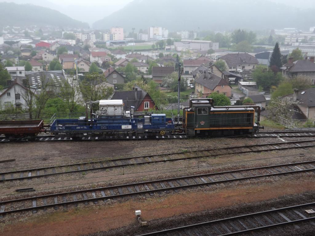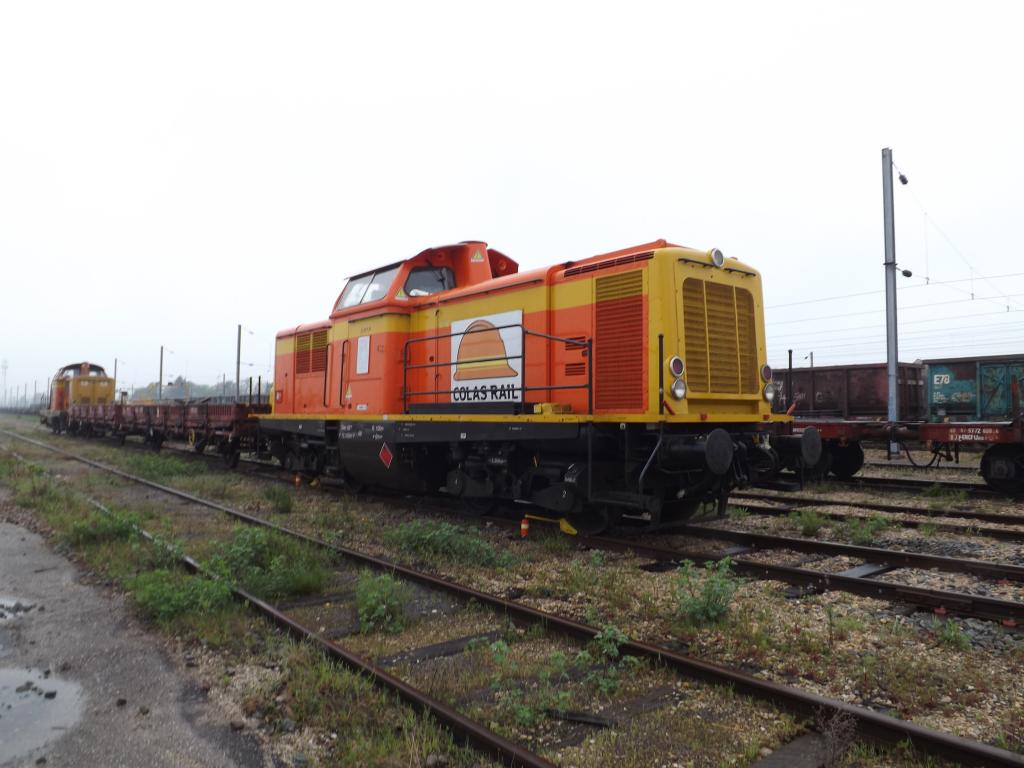 Passage à Danjoutin, aux abords de la zone de stockage des matériaux usés. La G1206 Jennifer est en attente avec une rame remplis de coupon de voie et de vieux ballast. Attends le déchargement.
