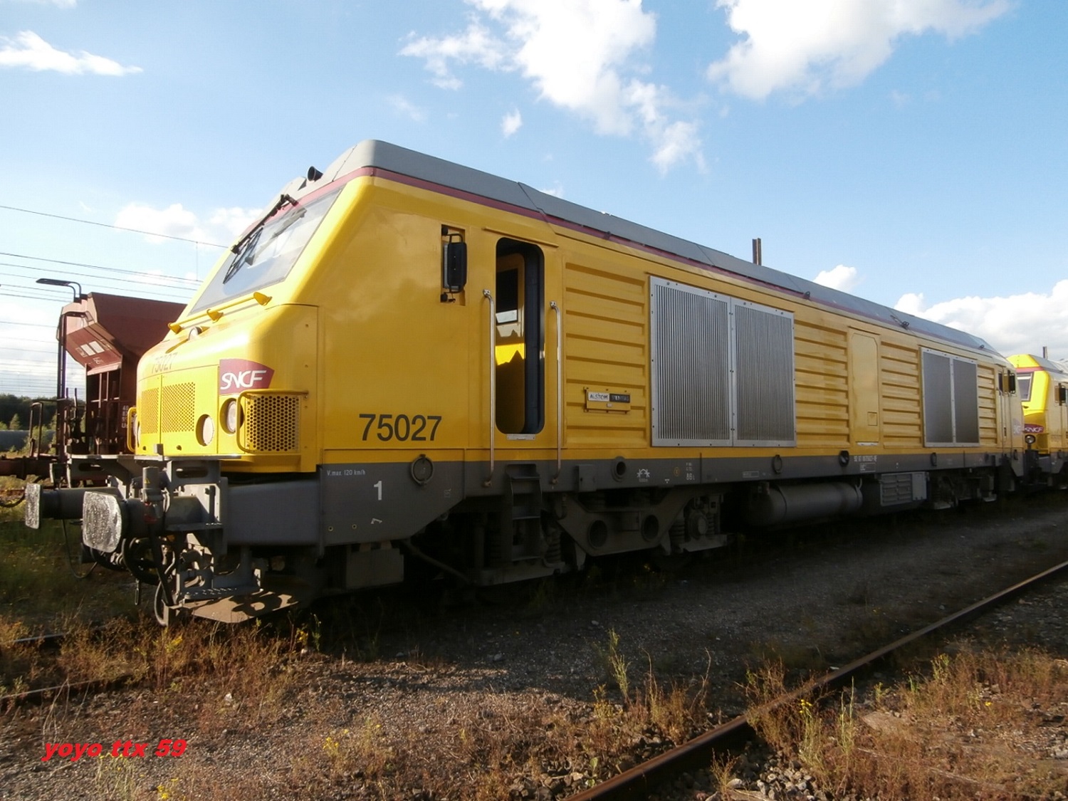 Voici la 75027 en livrée jaune pas de logo Infra et le toit en gris avec la 67528 en livrée Fret à la sortie du dépôt de Saint Pierre des Corps