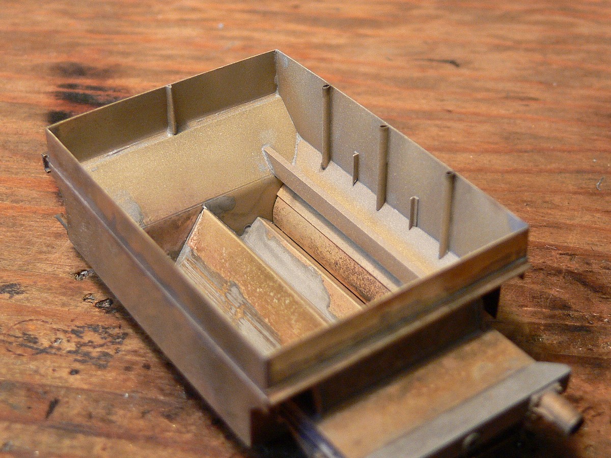 On prend les bords d'une plaque de photogravure d'un kit terminé bien d’équerre (à garder précieusement), d'une largeur de 1.5 mm pour faire le bord haut de la benne et on soude :