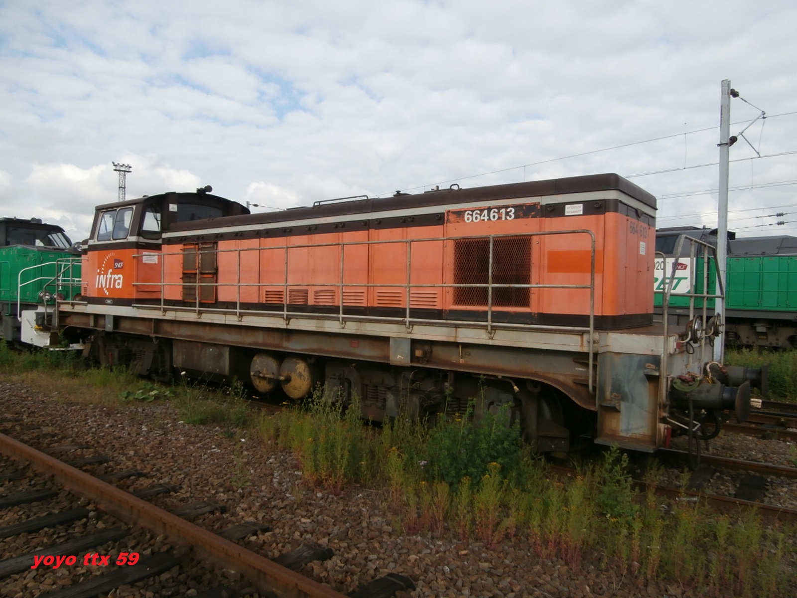 Voici la 664613 Infra en livrée Arzens avec son train désherbeur à Saint Pierre des Corps lundi 10 mars 2014