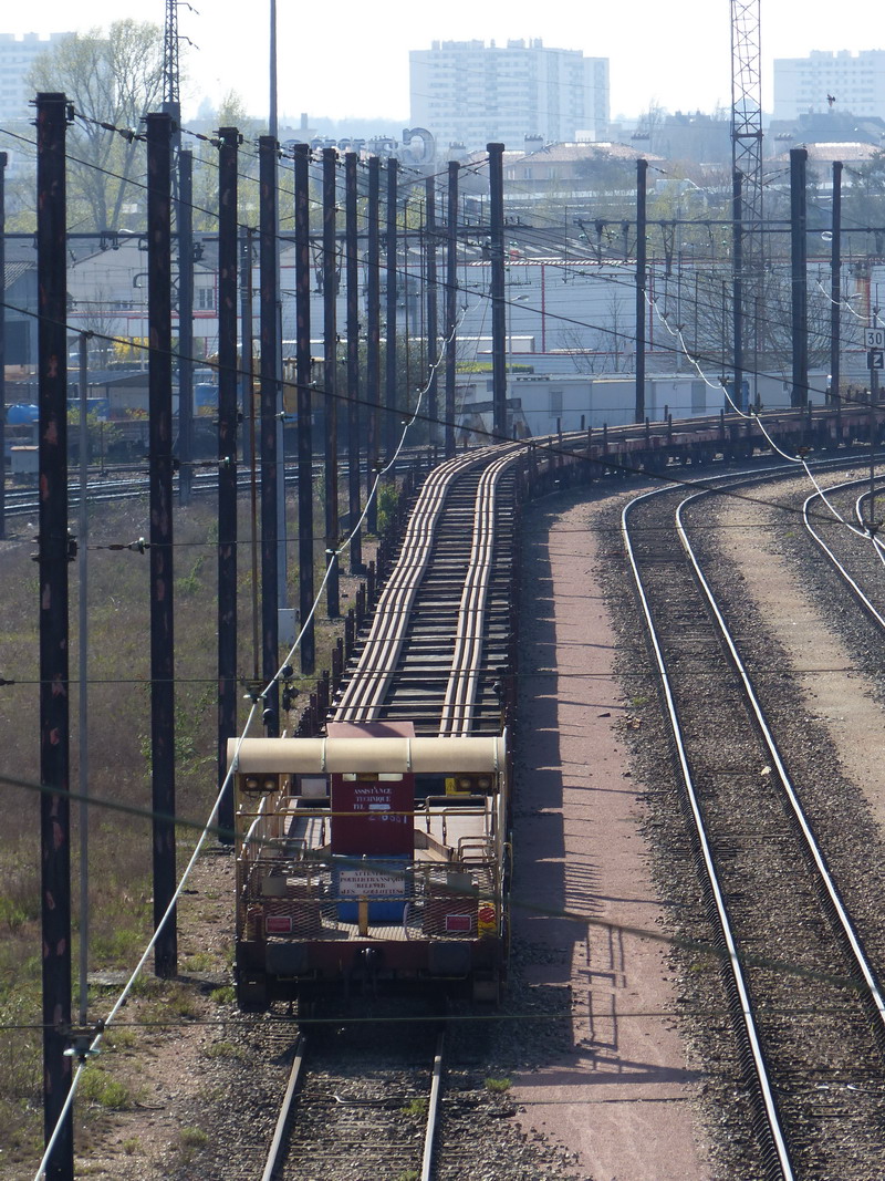 Voici le wagon 40 87 959 7 198-0 Us V76 1 SNCF-PN du LRS N°27 vide qui arrive sur une rame Infra à 15h40 avec les machines