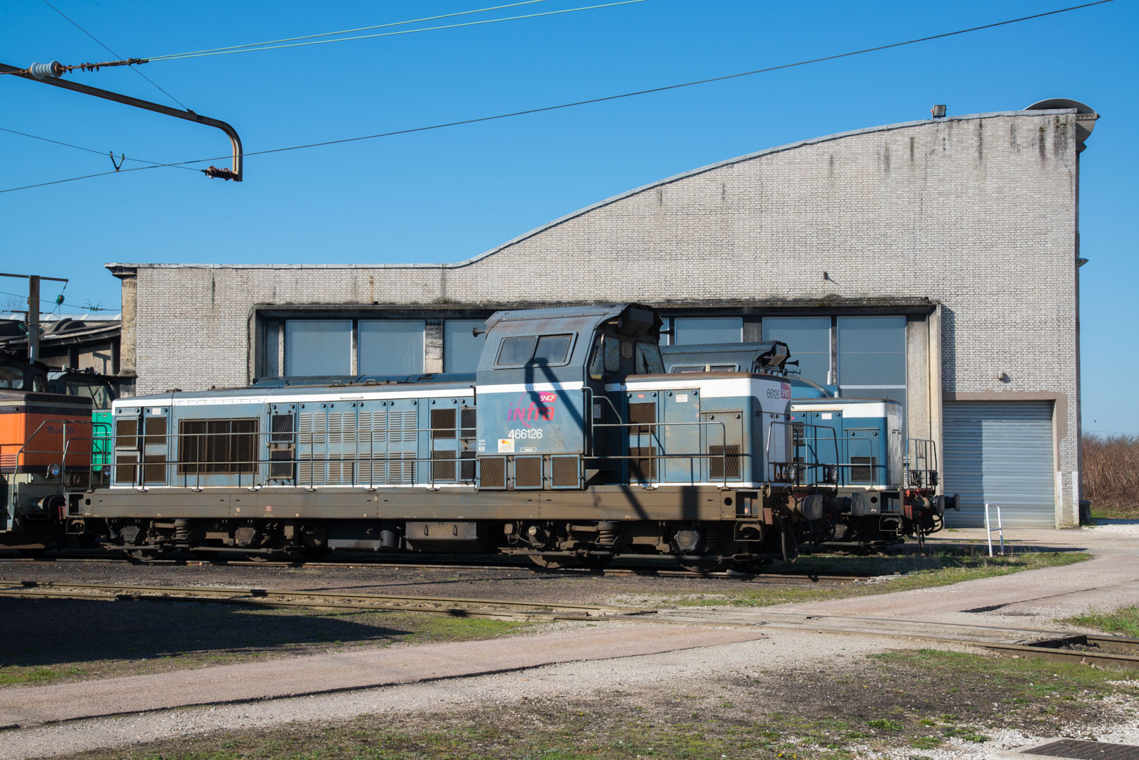 Voici la 466126 en livrée bleu avec le logo Infra et un marquage T1 - T2 ? dans le dépôt de St Pierre des Corps