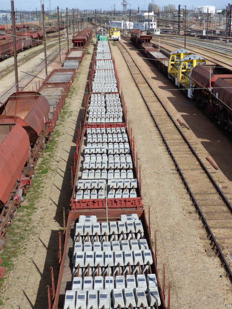 Voici un wagon plat à essieux 40 87 953 4 979-9 Us K39 1 SNCF-PSL avec un chargement de traverses sur une rame infra