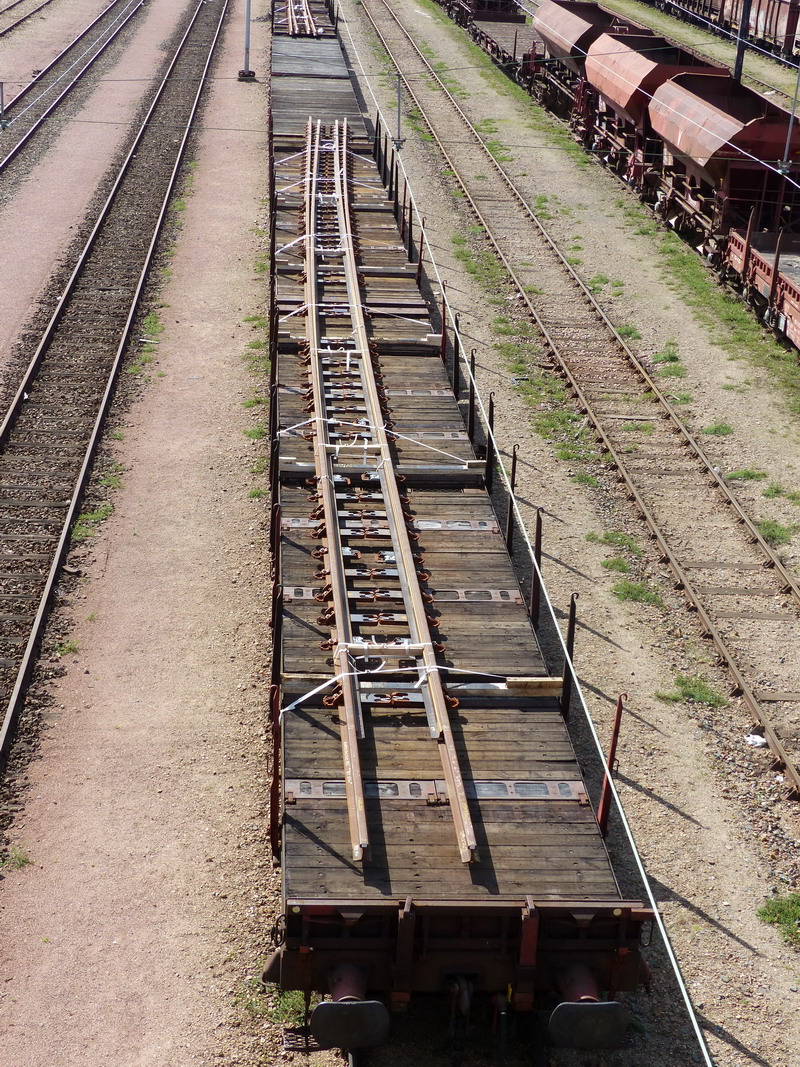 Voici un appareil de voie sur 3 wagons plats sur les voies de garage des rames Infra/SNCF de Saint Pierre des Corps