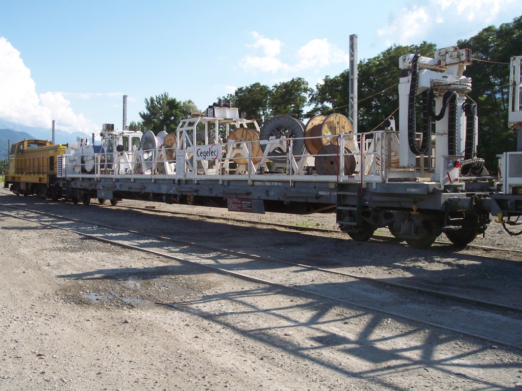Le wagon dérouleur Cegelec 99 87 9 332 504-9 et le wagon plate forme 99 87 9 336 522-7 sur les voies de garage des rames INFRA/SNCF