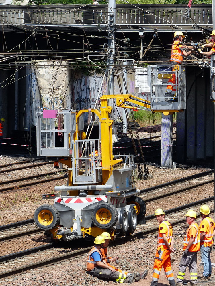 Voici un 4'Axe SNCF-TR 61 sur sa remorque 6683 XK 37 du Crem DV13 pour Tours sur le pont Jean Moulin entre la Socofer et la gare de Saint Pierre des Corps le mardi 08 juillet 2014