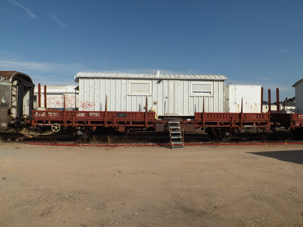 Voici le wagon plat à essieux 40 87 959 4 599-2 Us K55 1 F SNCF-CF Point d'attache Clermont-Ferrand avec un bungalow
