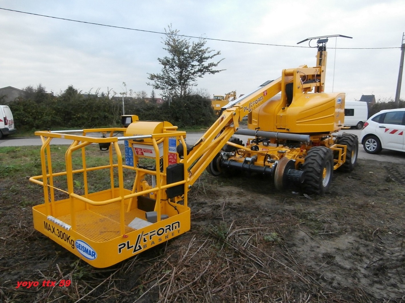 Cette nacelle était en essais pour le compte de Colas Rail sur le chantier de changement d'appareils de voies a Hazebrouck le 01/11/2014 .