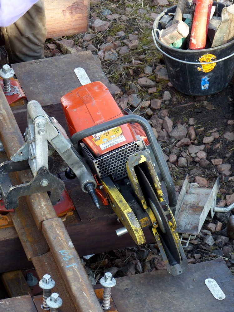 Le triangle jaune dont tu parles est tout simplement une équerre. Elle permet de vérifier que la traverse est bien perpendiculaire au rail.