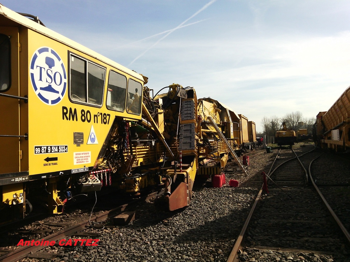 - la RM 80 n'est plus utilisée sur les suites rapides car TSO a d'autres engins pour ce travail, par contre, pour des raisons techniques et de mise en conformité avec des normes, il a été nécessaire de la placer sur des bogies à 23 t/essieu, type TY23Lsm de Sambre et Meuse et de placer la partie motrice sur un wagon, le wagon pousseur. A noter que les 2 groupes hydrauliques qui existaient sur la RM 80 sont conservés et renforcés par le groupe placé sur le wagon. On gagne ainsi en fiabilité.
