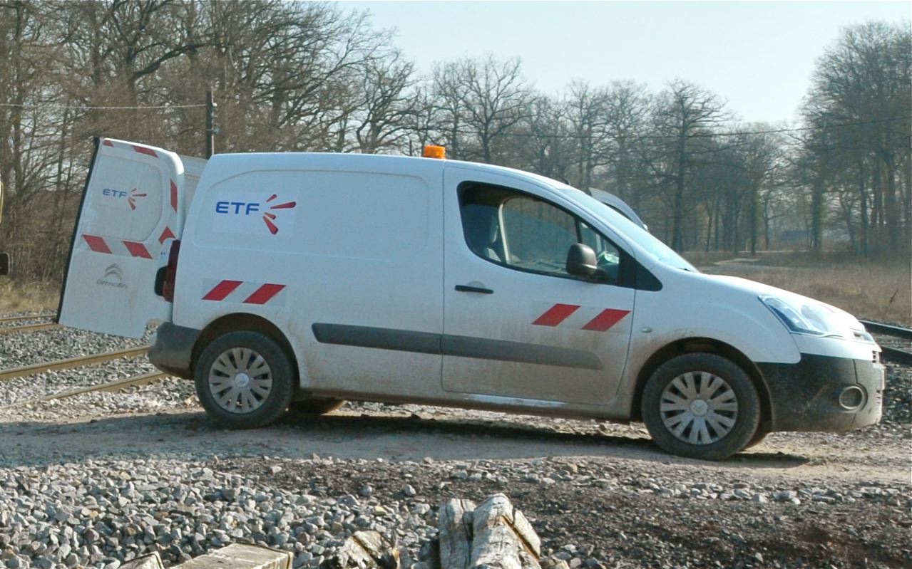 Voici un camion caténaire et deux véhicules ETF à Saint Pierre des Corps le samedi 31 juillet 2015
