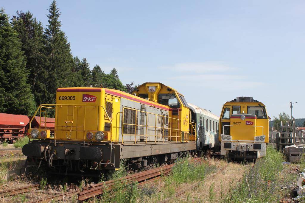 Voici la 669305 en livrée Infra ex 66305 avec la 22383 Infra sans le logo avec des wagons plat à boggies R35 6 pour le transport de traverses