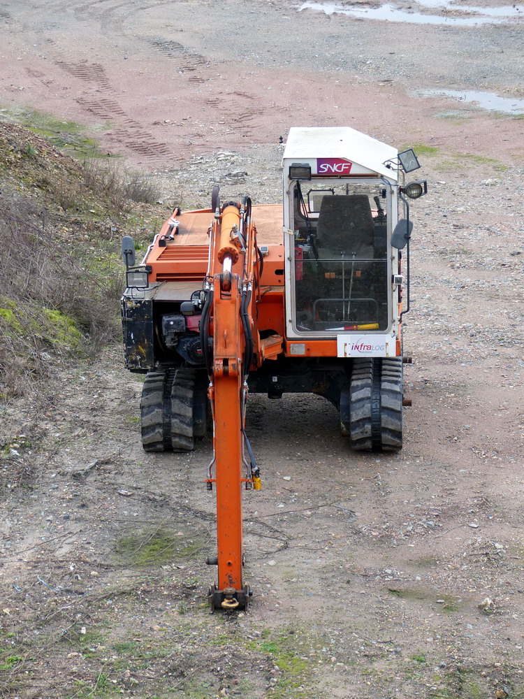 Voici une pelleteuse SCHAEFF HR 31 SNCF-Infralog Bretagne sur son wagon 80 87 979 4 784-9 Uas R55 6 F SNCF-RN (Point d'attache Rennes