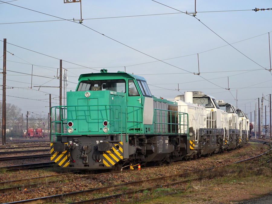Voici des photos de Thierry Mazoyer à l'arrivée du TM sur le triage des Aubrais (45) le 14 janvier 2018 en provenance de Strasbourg Port du Rhin avec les 4 nouvelles machines Vossloh DE 18 pour Eiffage ERS