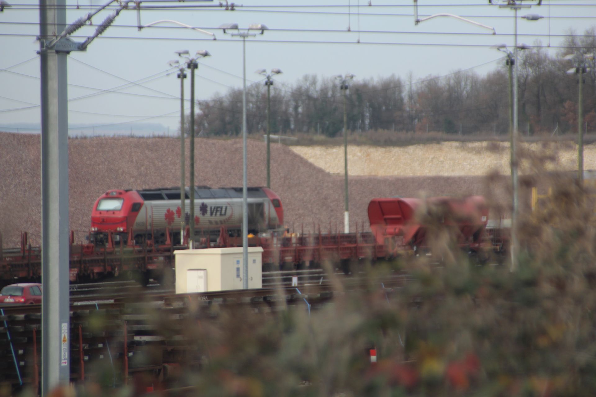 Une UM 75000 manœuvrent une rame de ballaste.