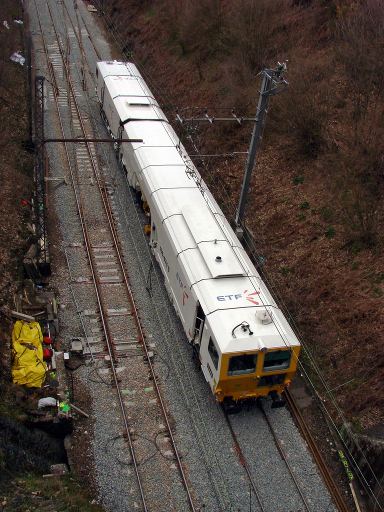 La machine en attente côté nord de la gare avant d'intervenir. Pendant ce temps, le ballastage d'un coupon de voie principale (V1) est en cours.