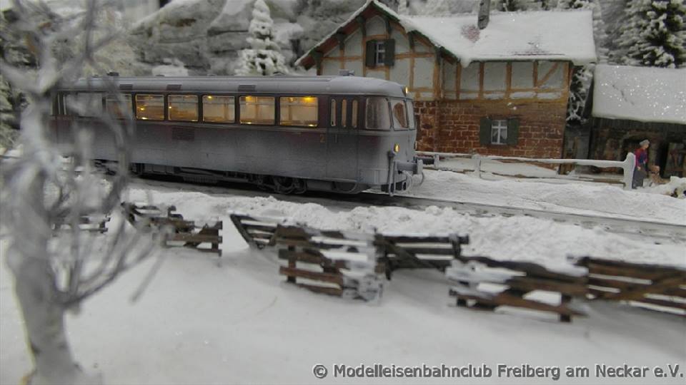 A J-12 nous reprenons le tour d'horizon des 19 réseaux qui seront présentés au Valdahon. Nos amis Allemands du club de Maulbronn ville jumelée avec Valdahon présenteront un réseau HO de 9 mètres de long en voie Marklin reproduisant un décor hivernal et automnal, remarquablement représenté et riches en détails. Chose rare : même le matériel roulant a été modifié pour correspondre à la saison. Ce réseau contient de nombreuses animations dissimulées aux quatre coins du décor, à vous de les trouver ! ! !