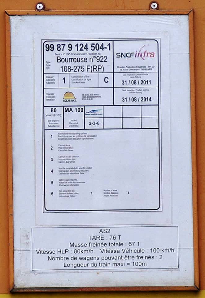 Agrément de travaille de l'époque VT 96 024 - 31-08-2011/2014 Framafer n°922 de 1991 - Colas Rail F 30000 18