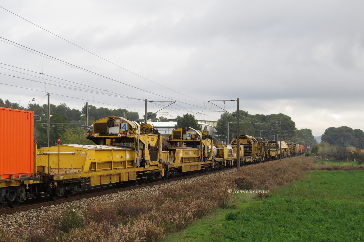 tractant des locomotives et des engins de renouvellement des voies et aussi une suite rapide ( non visible sur ce cliché car cachée par le bosquet.