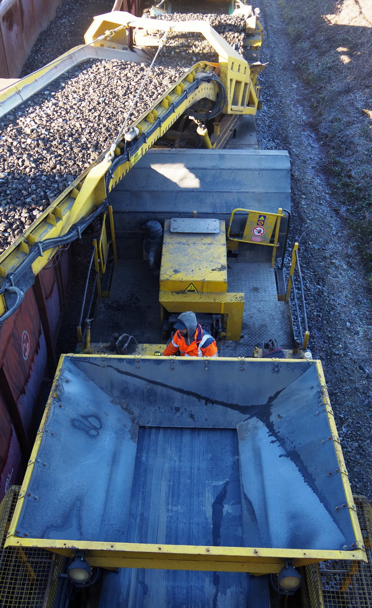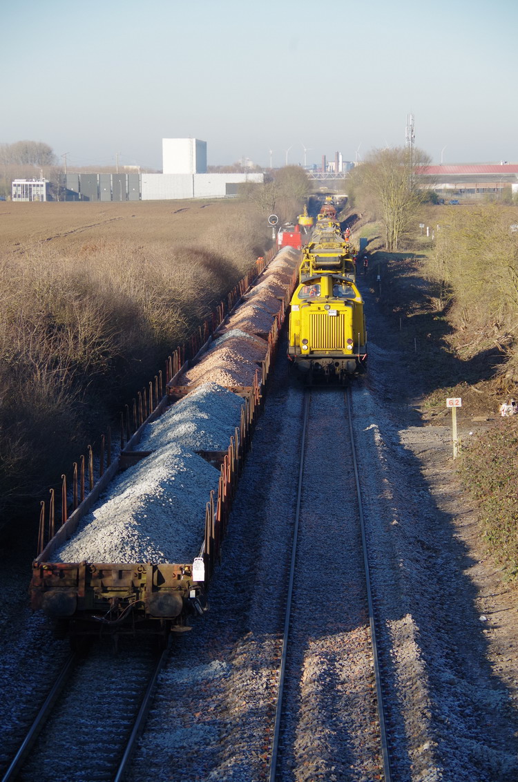la rame de travaux avec des wagons plats pour le ballast pour la nouvelle voie ferrée