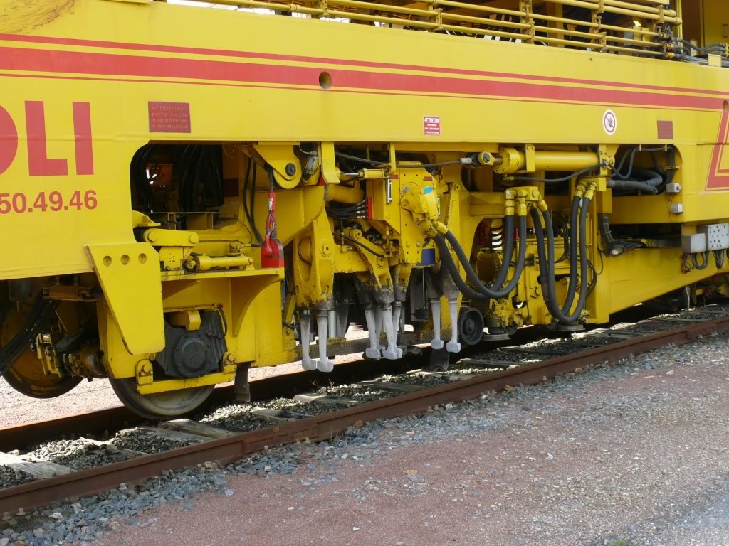 A l'extréme droite on apercoit également le "chasse pierre" permettant comme son nom l'indique de chasser le ballast présent sur le rail et autour du champignon afin que les galets du groupe de relevage puissent attraper le champignon sans aucunes difficultées.