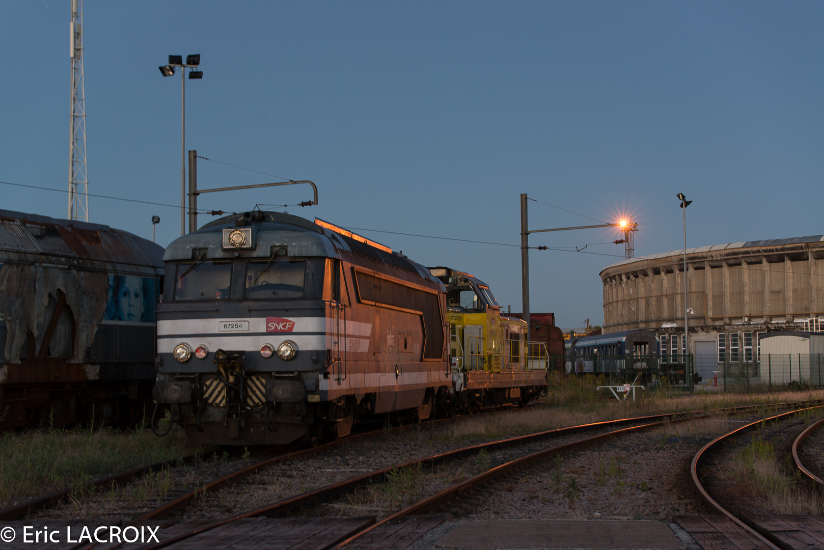 5h13, BB 67254 et BB 69414 au levé du jour, à Chalindrey en juillet 2016.