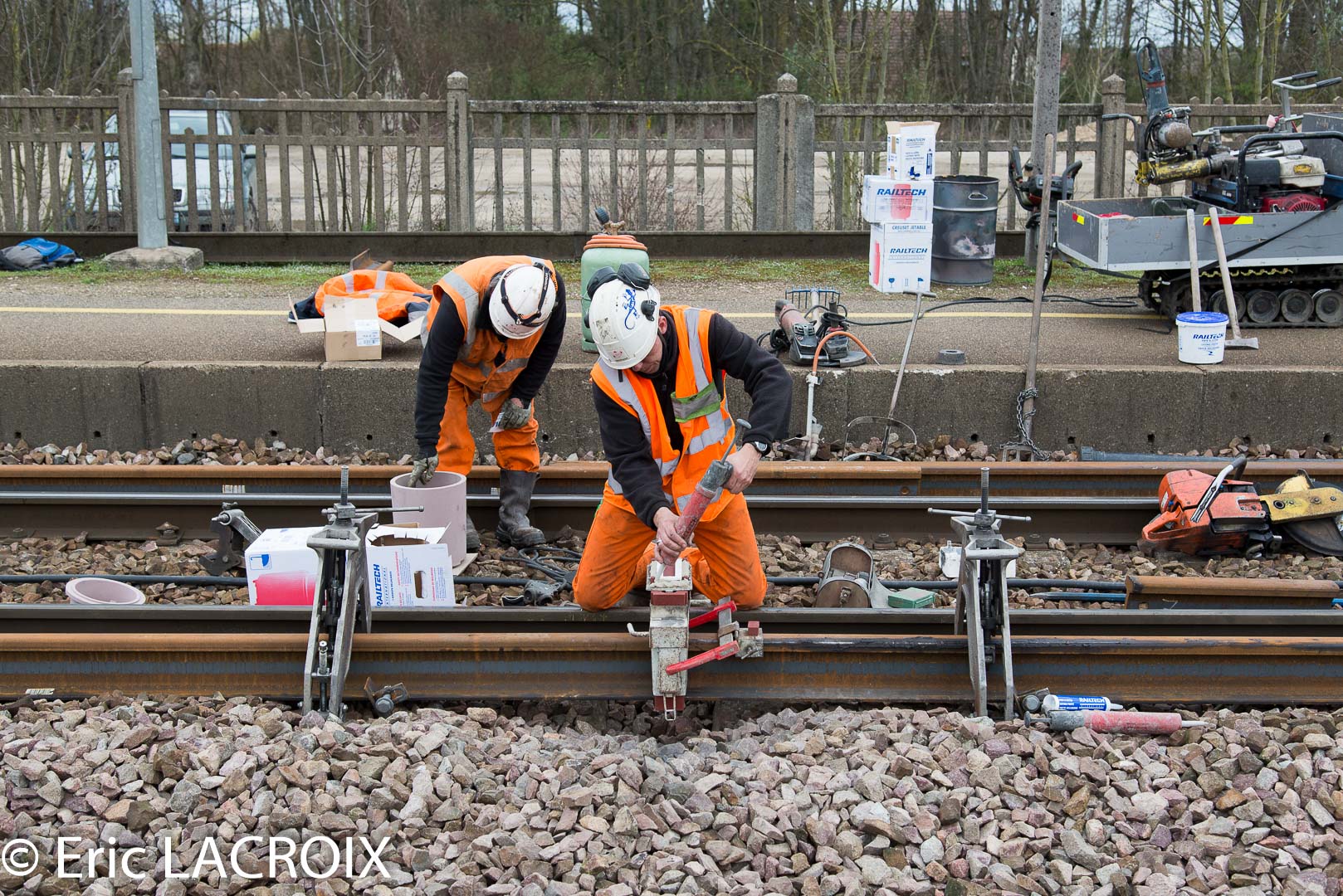 Soudure aluminothermique des rails par la Société LSF La Soudure Ferroviaire. RVB Villeneuve la Guyard le 20 mars 2017.