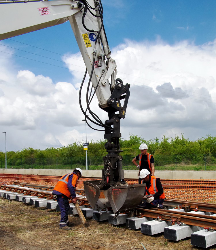 - fixation par des tirefonds ou boulons avec des rondelles, des traverses en béton sur le rail avec système crapaud