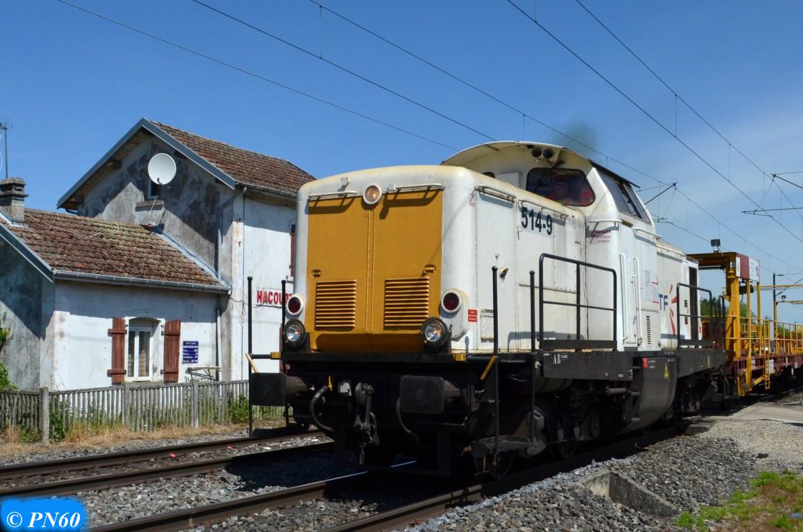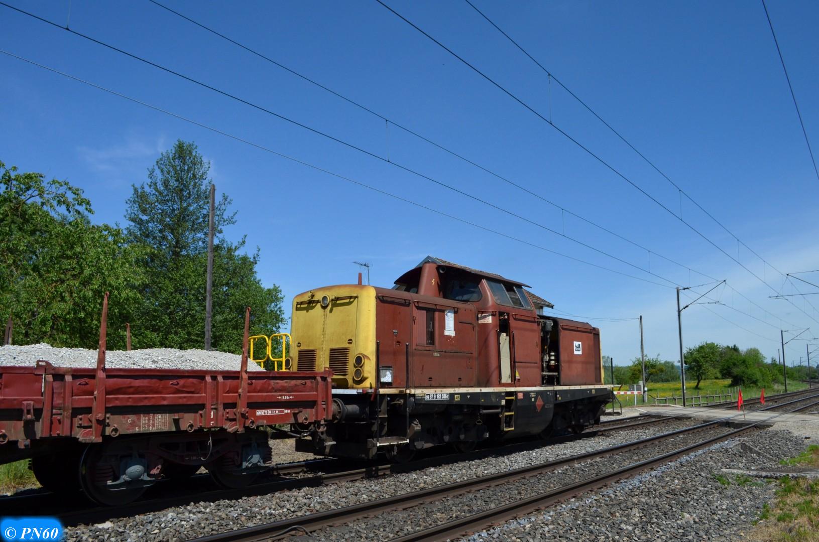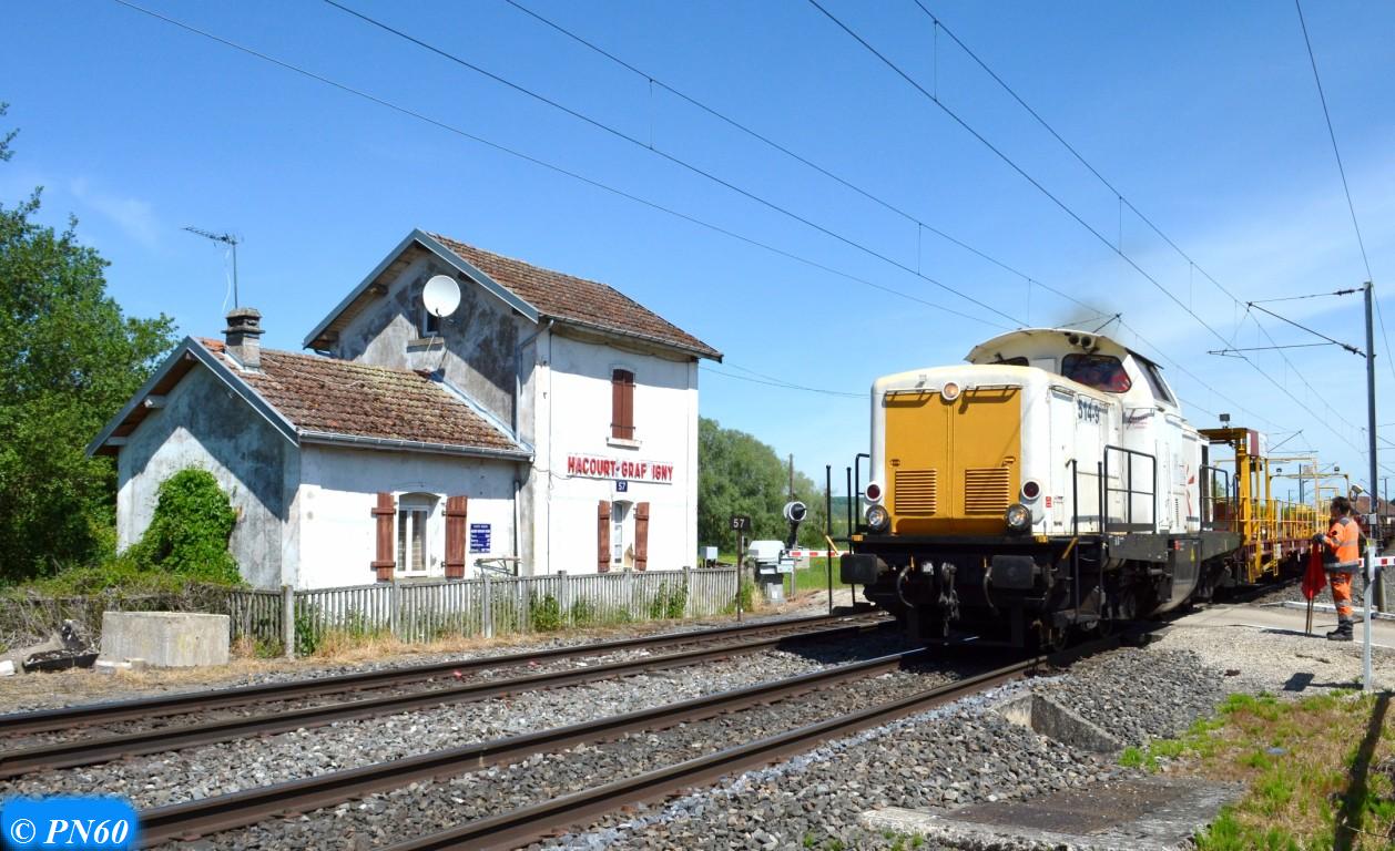 Toujours le 22 mai 2017, nous retrouvons notre train de travaux cette fois ci au niveau du PN 57 d'Hacourt, lieu d'emplacement de l'ancienne Halte Hacourt - Graffigny :D
