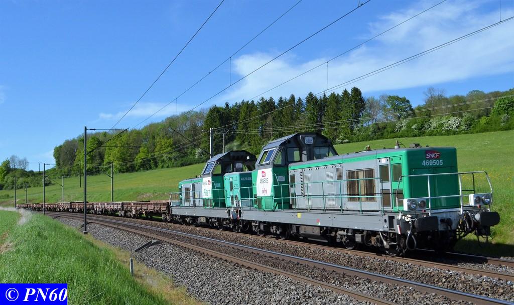 un UM de BB 69000 (69505 & 69488) tracte un court train de wagons plats en direction de Chalindrey.