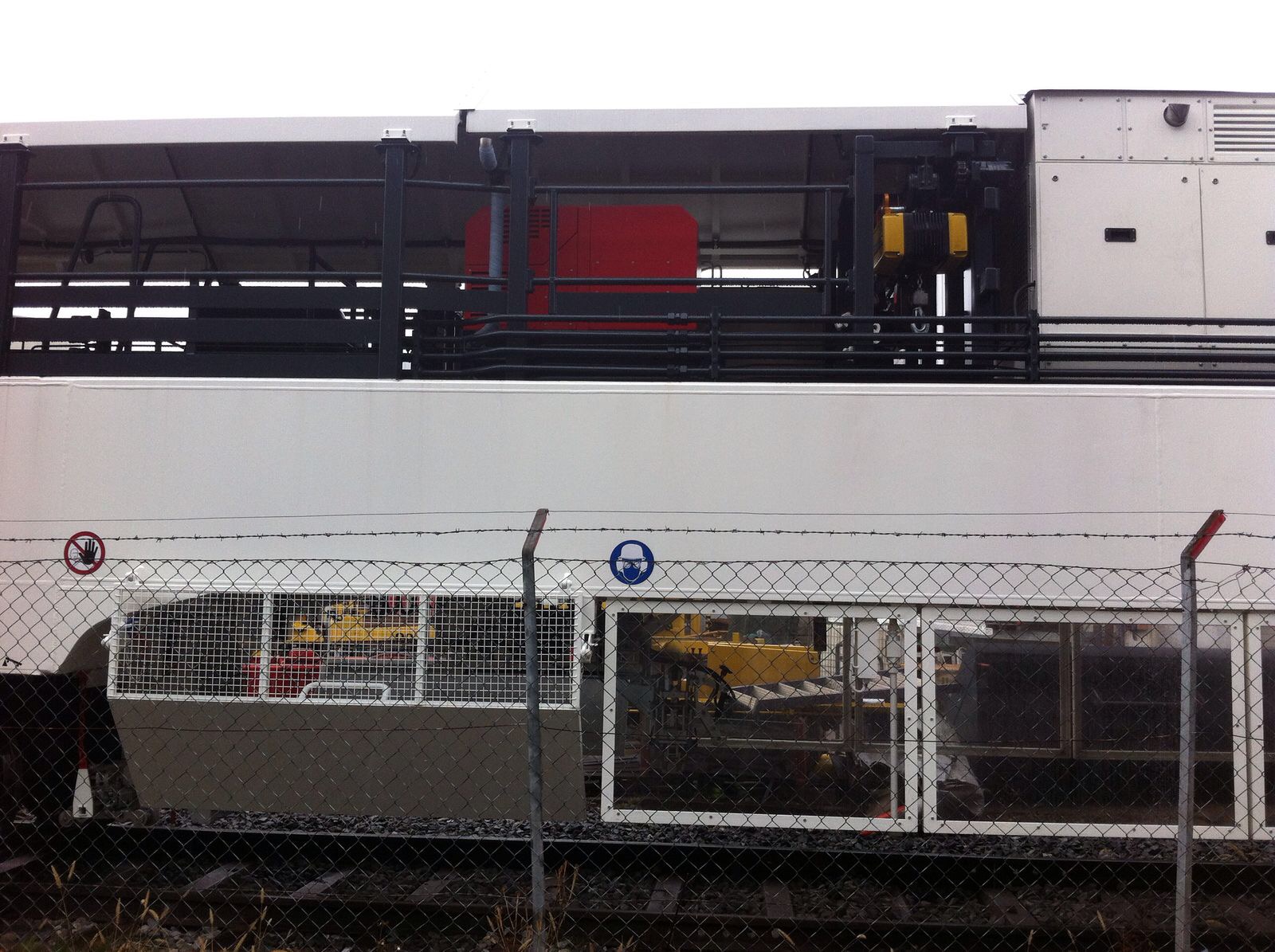 A l'intérieur : Nous pouvons voir les outils, l'énergie, les cabines, les sièges pour les ouvriers, l'extraction des gaz de soudure, le treuil pour manipuler les traverses et leurs points de stockage de part et autres du treuil. les trois treuils pour les coupons de rail (par fil de rail) six en tout.