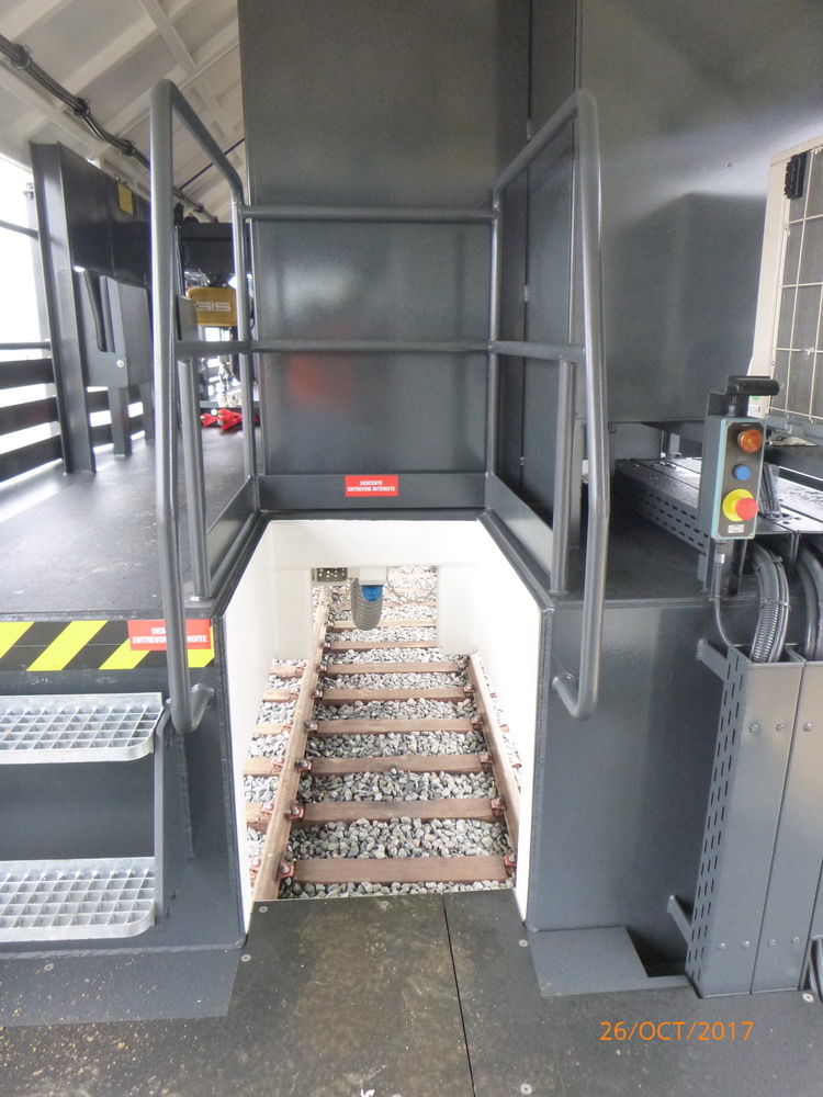 En dessous : la clipeuse, les supports des rails en position haute (dommage pas de rail à l'intérieur). La manche d'extraction de la fumée, il est très vitré sauf aux emplacement dédiés au travail: coupe soudure des rails