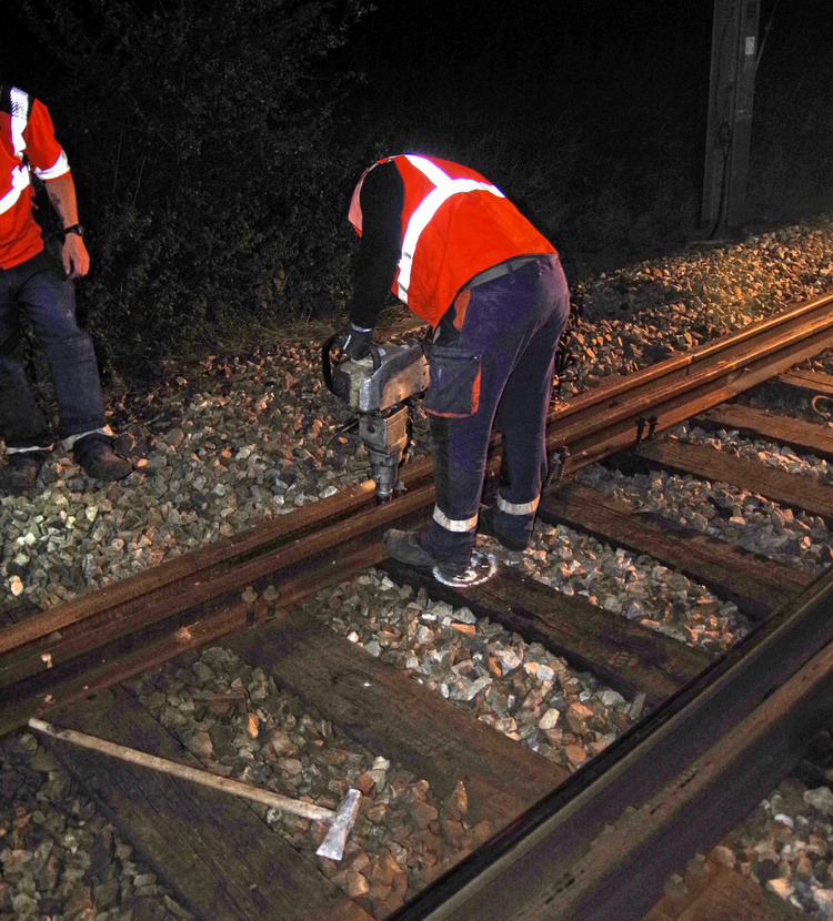 (le poste n'a plus l'assurance que l'aiguille colle dans la bonne direction et ne peut donc ouvrir les signaux)On soude le tout (à raison de 45' par soudure, x3 soudures, on est dans les 2h), là aussi avec une précision chirurgicale : une soudure c'est un point faible dans la voie, le moindre défaut peut s'accentuer très vite et provoquer des dommages.