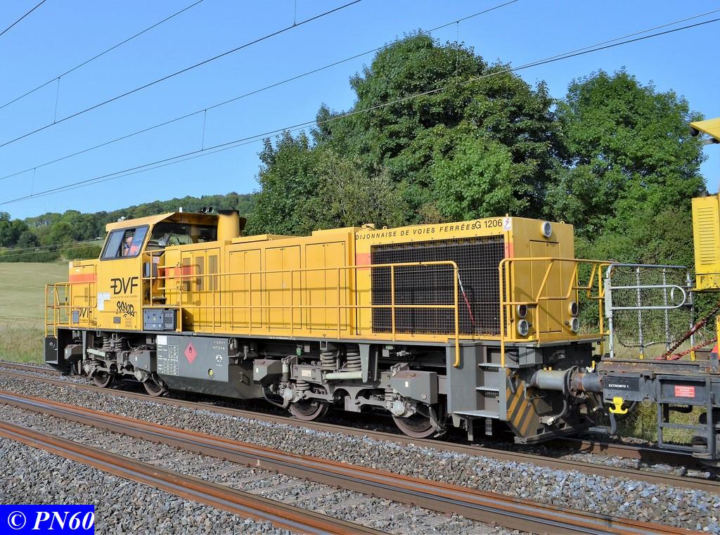 Un autre train de travaux photographié le 29 août 2017 sur la ligne 15 à Brainville sur Meuse. Celui-ci est tracté par une G.1206 DVF (Dijonnaise de Voies Ferrées).
