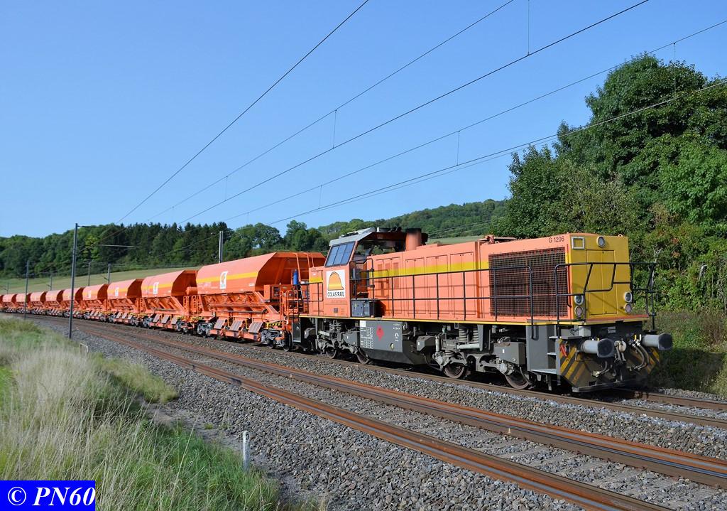 Suite et fin du train de travaux photographié le 29 août 2017 sur la ligne 15 à Brainville sur Meuse. Celui-ci est tracté par une G.1206 DVF (Dijonnaise de Voies Ferrées) et poussé par une G.1206 de Colas Rail n° 92 87 001 766-0 F-VL.
