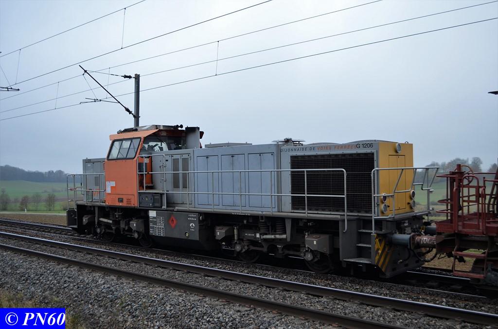 Ensuite nous arrivons au niveau du train de dégarnissage qui a été scindé en deux pour les travaux. A l'arrière se trouve le train de wagons de ballast poussé par la G.1206 99 87 9 181 537-1 de la Dijonnaise de Voies Ferrées. Nous reviendrons en détail sur cette machine un peu plus tard.