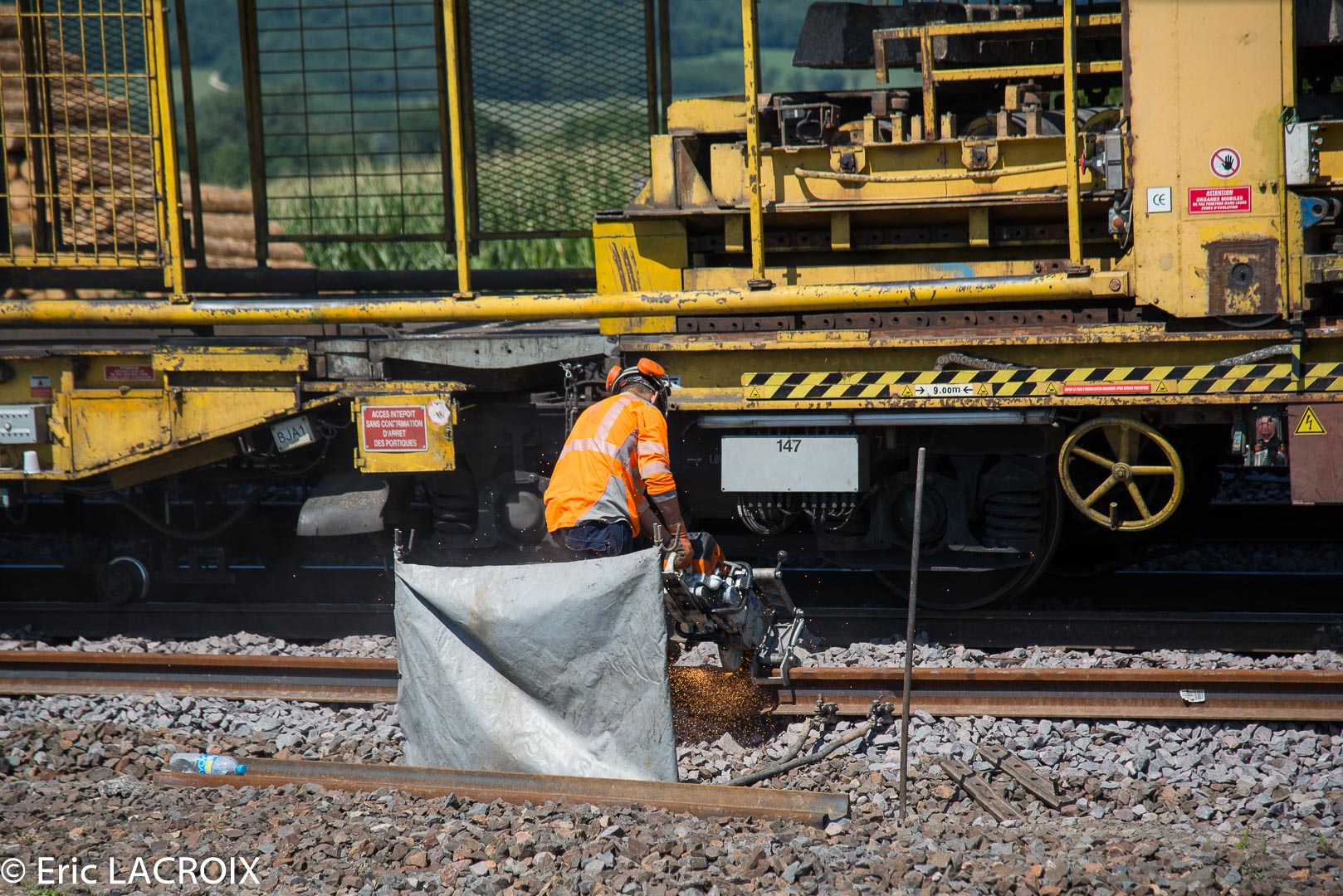 Ensuite nous arrivons au niveau du train de dégarnissage qui a été scindé en deux pour les travaux. A l'arrière se trouve le train de wagons de ballast poussé par la G.1206 99 87 9 181 537-1 de la Dijonnaise de Voies Ferrées.