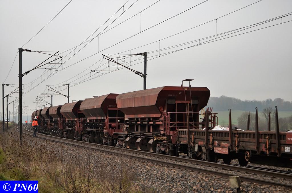 Une centaine de mètres derrière le train de dégarnissage COLAS RAIL RM 900-HD 100 AHM en action à Brainville sur Meuse le 16 novembre 2017, un second train de wagons trémies poussé par la G.1206 99 87 9 181 537-1 de la Dijonnaise de Voies Ferrées fait un apport en ballast neuf. Ce train est dirigé par radio par un agent posté sur le premier wagon plat situé en tête.