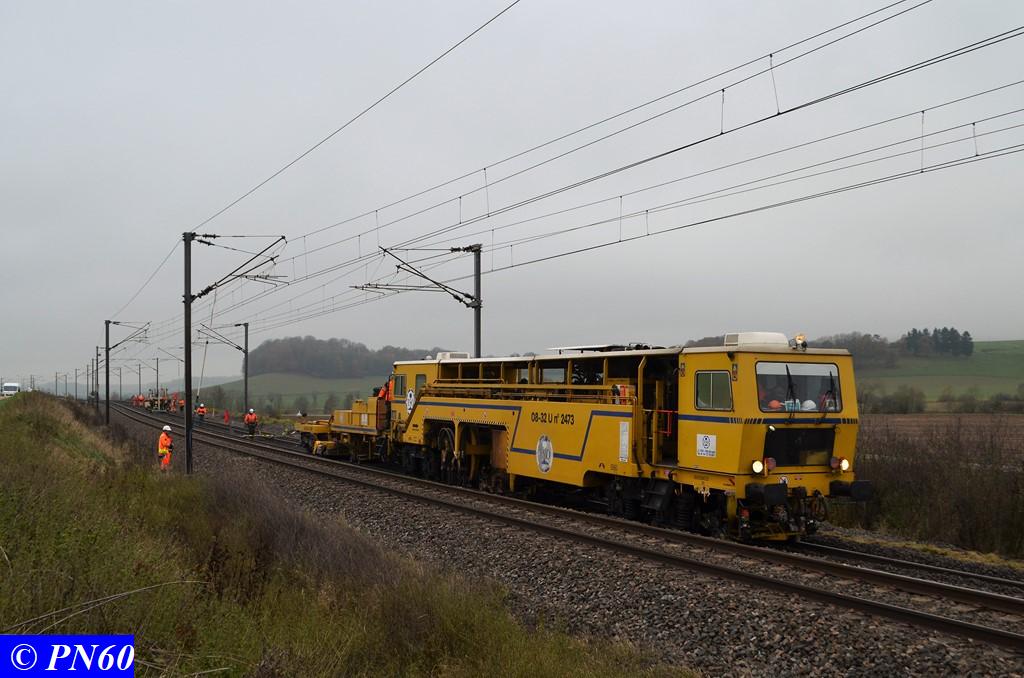 Poursuivant notre reportage photo, nous quittons le train de chantier poussé par la G.1206 99 87 9 181 537-1 de la Dijonnaise de Voies Ferrées. A l'arrière à quelques mètres suit la bourreuse de ligne TSO type 08-32 U n° 99 87 9 122 512-6 2473 et plusieurs ouvriers.