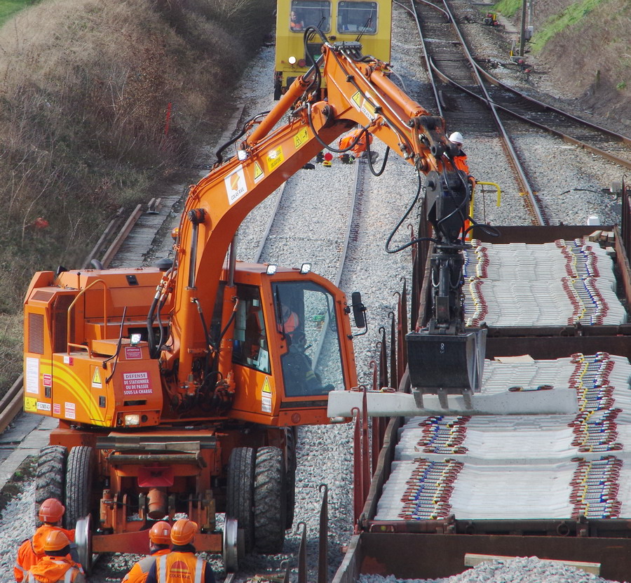 mise en place des traverses béton avec la Pelle Rail route CASE 788PRR n°CGG0229086 de Colas Rail F 62000 43 à Jussy le 14-02-2018