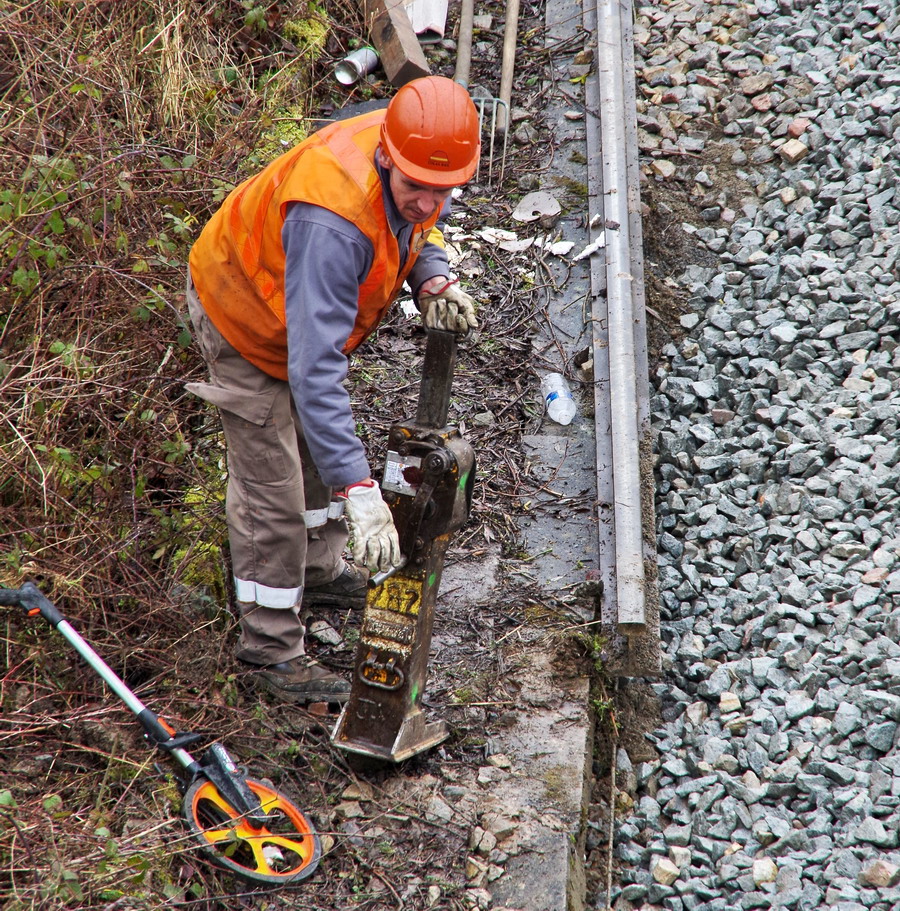 un homme de Colas Rail avec une fourche sur la zone de travaux entre la bifurcation et des Ponts de Bray à Jussy le 15-02-2018