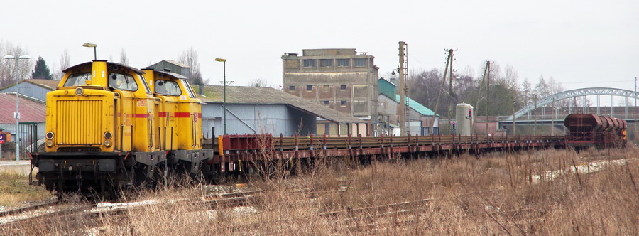 V211R 99 87 9 182 537-0 de Colas Rail sur une rame de TTX dans la cour de la gare de Chaulnes le 20-02-2018