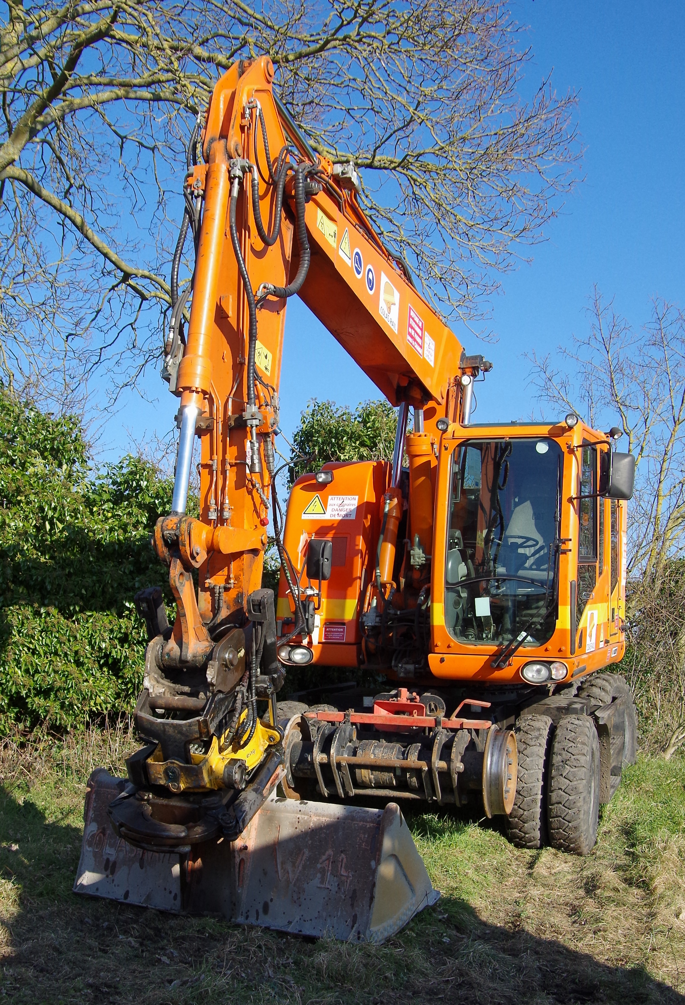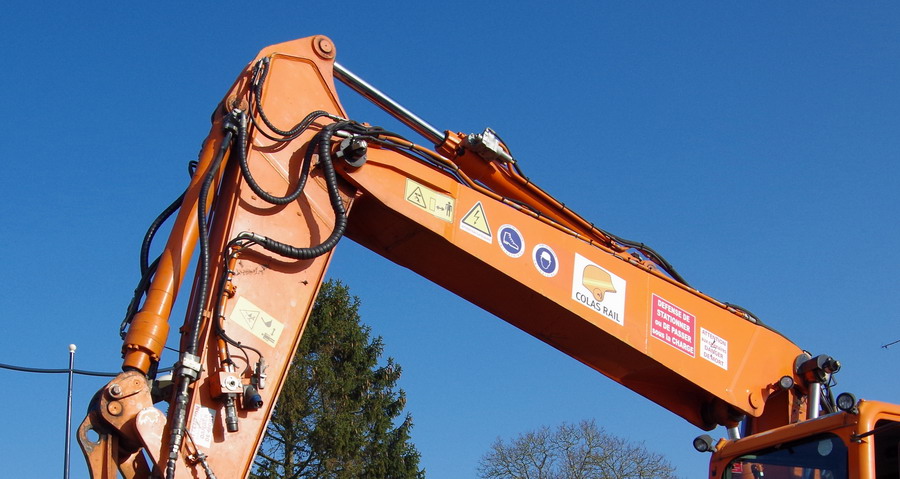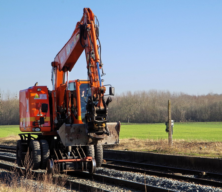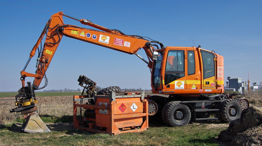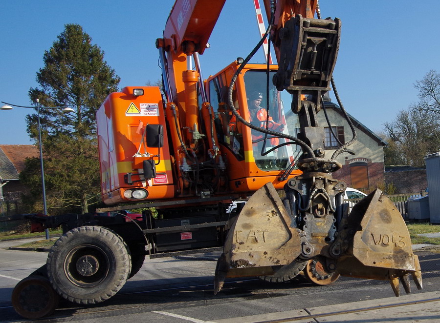 la Pelle Rail-route va se mettre sur les rails elle profite du passage a niveau pour se mettre sur les rail puis elle part sur la zone de chantier