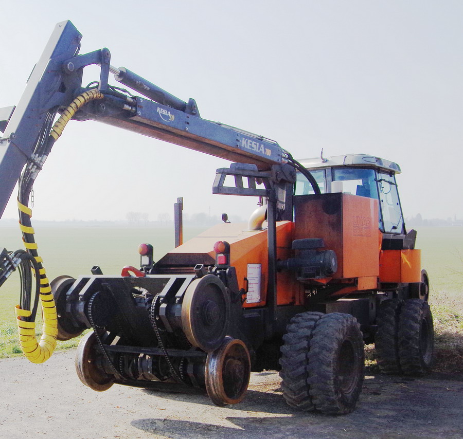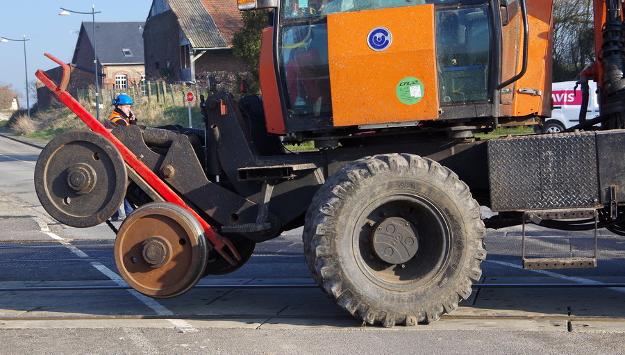la débroussailleuse rail-route va se mettre sur les rails elle profite du passage a niveau pour se mettre sur les rail puis elle part
