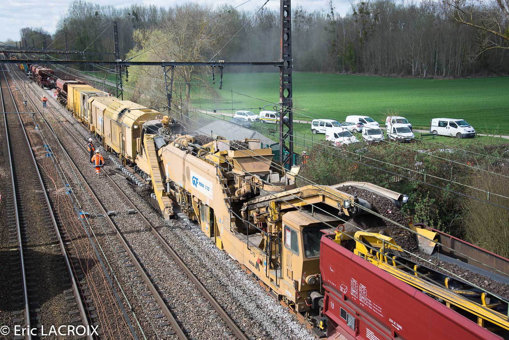 Dégarnisseuse Cribleuse Matisa C-75 - 99 87 9 314 507-4 GCF Roma sur le RVB voie 1 bis à Villeneuve la Guyard (89) en mars 2017.